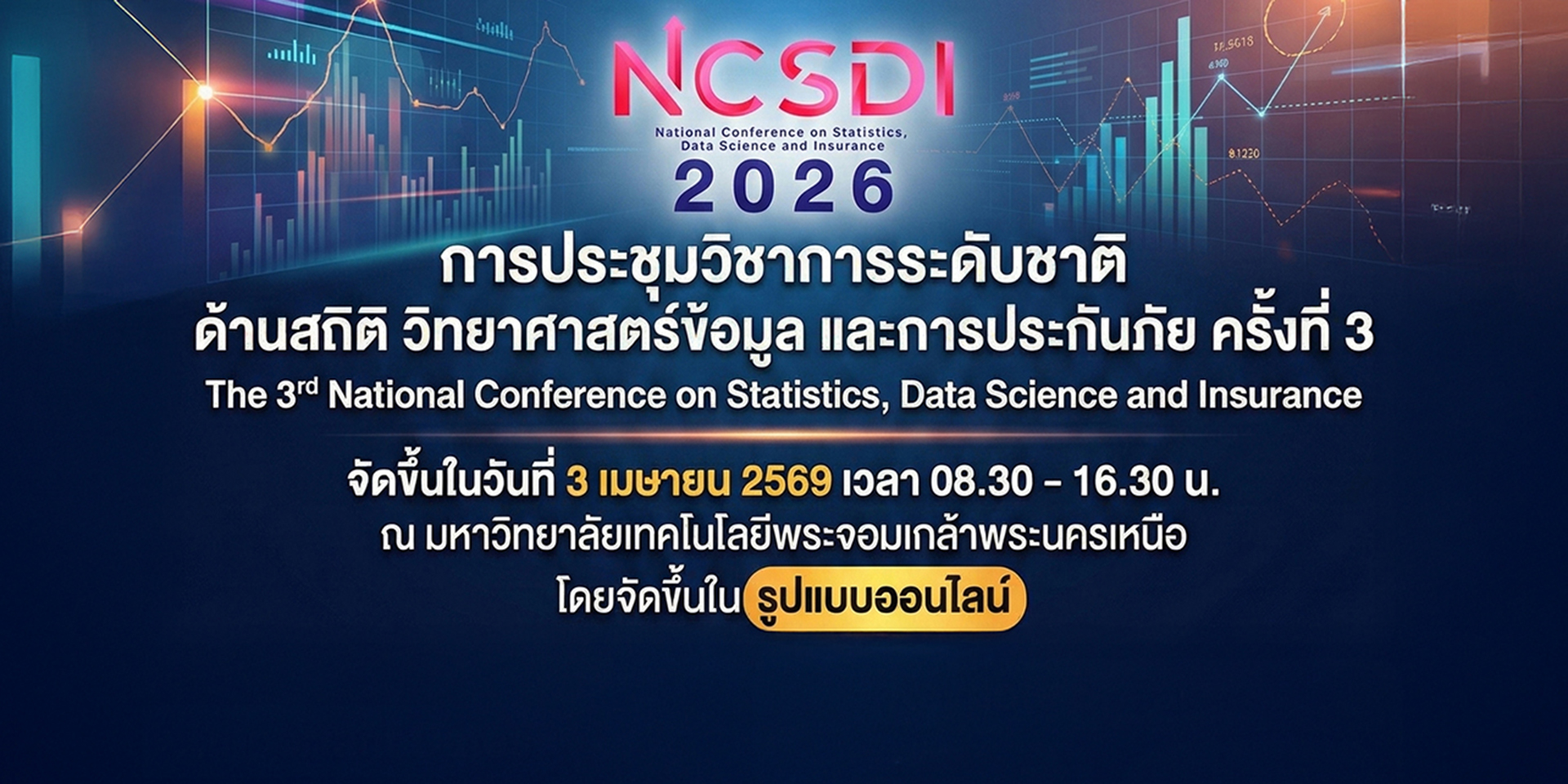 การประชุมวิชาการระดับชาติ ด้านสถิติ วิทยาศาสตร์ข้อมูล และการประกันภัย ครั้งที่ 3 จัดขึ้นในวันที่ 3 เมษายน 2569 ณ มหาวิทยาลัยเทคโนโลยีพระจอมเกล้าพระนครเหนือ โดยจัดขึ้นในรูปแบบออนไลน์ มีลักษณะการประชุมเป็นการนำเสนอผลงานทางวิชาการของผู้เข้าร่วมประชุมในรูปแบบบรรยาย (Oral presentation) รูปแบบโปสเตอร์ (Poster presentation) และการบรรยายพิเศษจากวิทยากรผู้เชี่ยวชาญเฉพาะด้าน โดยมีจุดมุ่งหมายเพื่อสร้างเครือข่ายความร่วมมือทางวิชาการด้านสถิติ ด้านวิทยาศาสตร์ข้อมูล และด้านการประกันภัย ให้มีความเข้มแข็งทางวิชาการ และส่งเสริม พัฒนางานวิจัยทางด้านสถิติ วิทยาศาสตร์ข้อมูล และการประกันภัย ให้มีมาตรฐานและคุณภาพในระดับประเทศ อีกทั้งเป็นเวทีสำหรับการนำเสนอผลงานทางวิชาการและแลกเปลี่ยนประสบการณ์ของนักศึกษาทั้งในระดับปริญญาตรีและระดับบัณฑิตศึกษา